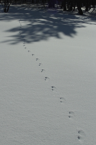 201412/19 三瓶山北の原は雪原に 観察スポット 0 12月19日(金)嵐が去って、今日は久々のお日様を拝みますた。 昼飯たばこに、ちょっこ北の原雪原を散歩。レンゲツツジの冬芽がこんにちは。この足跡の主は?