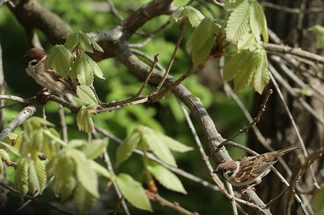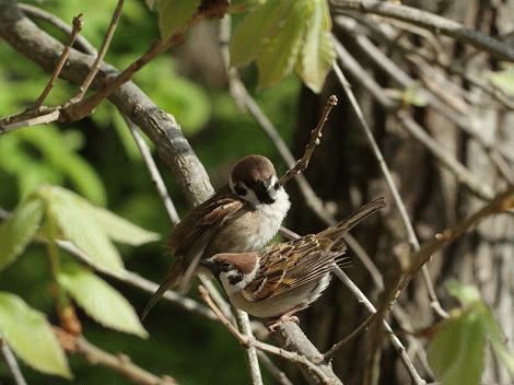 201305/16 朝も早よから・・・ 未選択 0 5月15日(水)今朝、サヒメルの本館と新館を結ぶ、回廊を新館に向かっていたところ、窓の外に雀らしき姿が見えた。 ま、雀たちはサヒメルの周りでも普通に見られるので珍しくもなかったのだが、ちょっと気になったので、そ~っと窓に近づいて外を眺めたら回廊脇の木の上に、2羽の雀がいることに気付いた。う~ん、これはひょっとすると~、朝も早よから、せっせこ、せっせこ、子作りに励む雀さんでした。 (画像がぶれているのは、興奮したせいではありませぬ。)