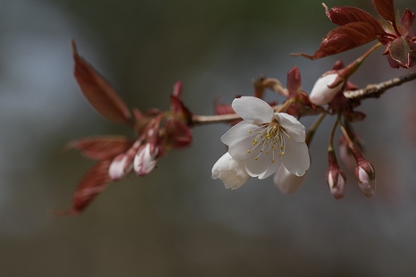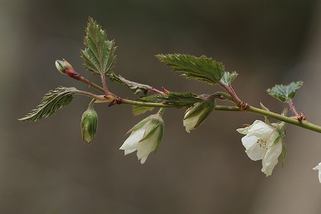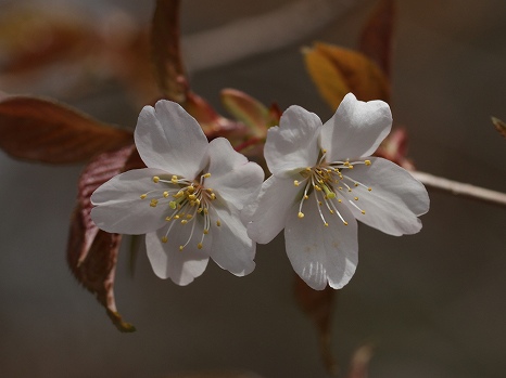 201304/14 風に流されキャンプ場へ 植物 0 4月14日(日)今日も、風が強い一日でした。 植物たちも風に流されて”ゆらゆらぴゅ~”だったので、カメラを構えるこちらもゆらゆらしながら、シャッターチャンスをうかがっていました。 草原よりも幾分風当たりの弱い、キャンプ場内をうろうろゆらゆらしました。ヤマザクラ(山桜)バラ科平野部の桜は花が散ってしまいましたが、北の原周辺では、「ヤマザクラ」さんが咲き始めてます。 「ソメイヨシノ(染井吉野)」さんも見事ですが、私はやはり「ヤマザクラ」さんが好きですね。クロキ(黒木)ハイノキ科この方は冬に「奇形花」をつけるのですが、皆さんは見られたことがありますか? 蕊はあるのですが、不稔です。ナガバモミジイチゴ(長葉紅葉苺)バラ科昨年は、この方の果実をあまり食べることができませんでした。 木苺の仲間のうちで一番美味しい実だと、私は思っています。今年はたくさん食べられるかな?リョウブ(令法)リョウブ科美味しそうな新葉でしょ。 でも、実際に食してみると、とりたてて美味いわけではありませぬ。 しかし、山菜天ぷらの材料には加えたくなります。ウグイスカグラ(鶯神楽)スイカズラ科何度でも写したくなる本当に愛らしい花です。 「早く果実が稔らないかな~。」