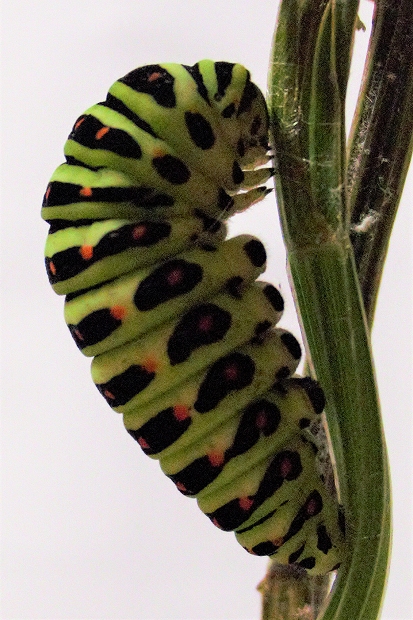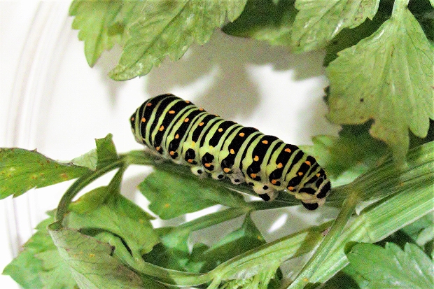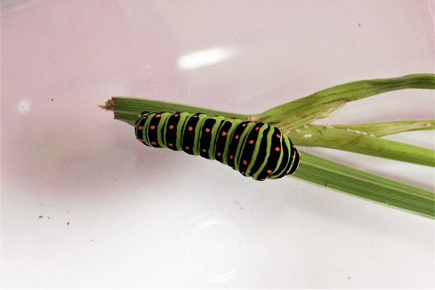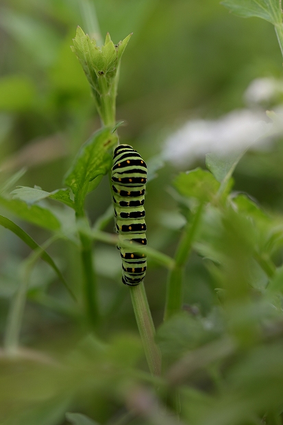 202007/18 キアゲハの幼虫 4 昆虫 0 令和2年7月18日(土)観察飼育を始めて4日目の「三郎」は体長40㎜を超え、元気にセリの葉を食んでいます。 昨日、前蛹から蛹になった個体は、色が黄緑になっていました。田んぼの縁のセリの小群落の中にキアゲハの終齢幼虫がいるのを見つけ撮影。
