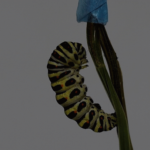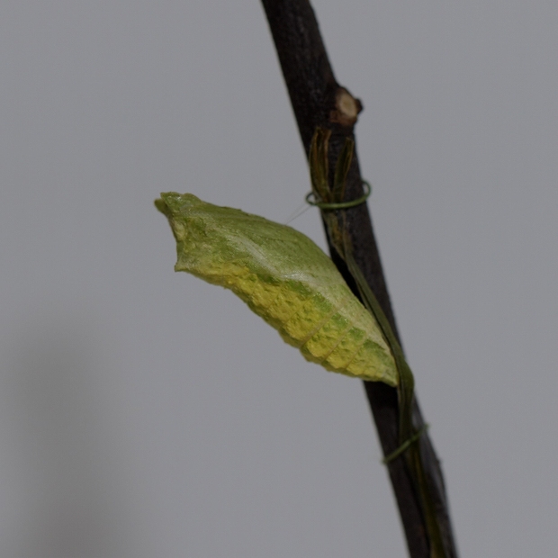 202007/17 キアゲハの幼虫 3 昆虫 0 令和2年7月17日(金) 飼育観察を始めて3日目の「三郎」は体長30㎜ほどになりました。そして昨日に前蛹状態になった終齢幼虫は、蛹に変態していました。 タイムラプス撮影の設定をして仕事に出かけたのですが、撮影間隔を少し長めにしていたので、下のような動画になりました。もう少し撮影間隔を短めにしていたら、脱皮するところが細かく見ることができたかも知れません。「三郎」が前蛹状態になったら、うまく撮影しようとおもいます。