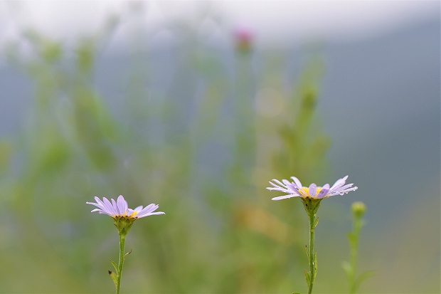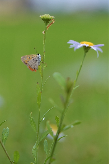 202007/24 圃場のまわりで 観察スポット 0 令和2年7月24日(金・祝)例年ならもう梅雨が明けている頃なのだが、けふも雨音が強弱を繰り返している。 苗への散水当番で会社へ出た折に、近くの圃場へ向かった。 圃場の周りにヨメナが咲き出しているのを先日見つけたので、撮影しようと思ったのだ。ヨメナ(嫁菜)ふと気づけば、ヨメナの茎にて小休止するベニシジミが、雨が止むのを念ずるよう。