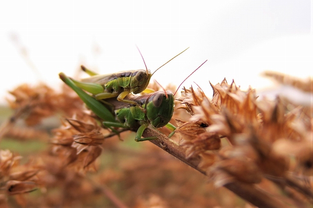 202010/29 翅長稲子 昆虫 0 10月28日(水)会社の圃場にて、エゴマの収穫をしていたところ、刈り倒したエゴマの上にイナゴさんが乗っかっているのを見つけた。おつながりの状態のところ、大変失礼いたしました。ハネナガイナゴ(翅長稲子)