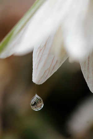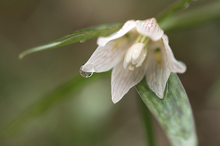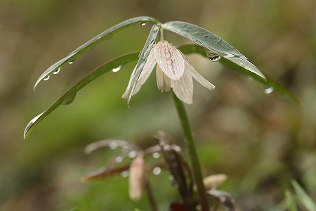 201103/23 川本町にて ~気の持ちようで~ 植物 0 3月21日(月)川本町の妖精たちが花を咲かせだした。 この時期には毎年訪れるのだが、今年は雪や寒さで開花は遅れていたそうだ。 川本在住の花友達に様子を尋ねたら、見ごろは27日頃ではないかと。 この日は小雨が降ったり止んだりを繰り返していて、撮影にはちょっと苦労したが、雫をまとって、より艶やかな「イズモコバイモ」さんを堪能した。アオイスミレ(葵菫)スミレ科イズモコバイモ(出雲小貝母)ユリ科雫の中に「イズモコバイモ」が映り込んでます。花びらに蜘蛛の糸でもついていたのか、雫がぶらさがっています。ミヤコアオイ(都葵)ウマノスズクサ科「イズモコバイモ」の自生地から、少し移動しました。 と道の脇の斜面に「アブラチャン」ちゃんが花を咲かせていました。アブラチャン(油瀝青)クスノキ科