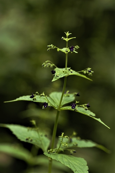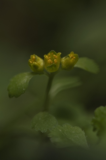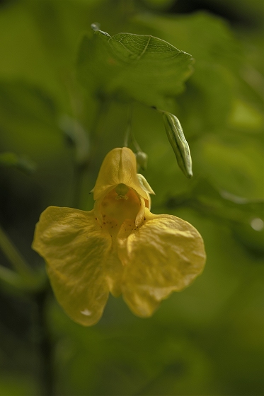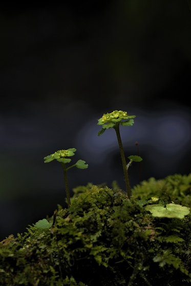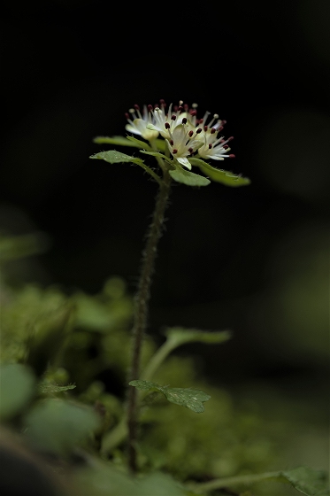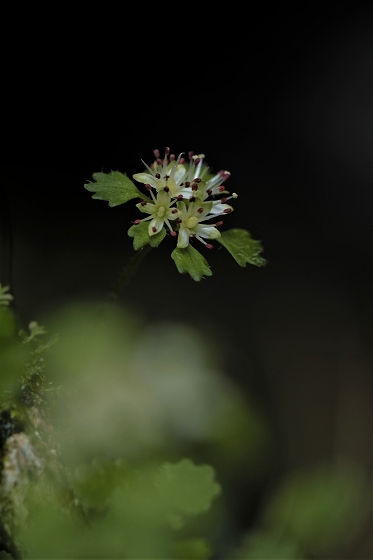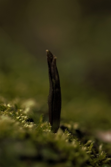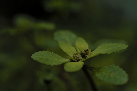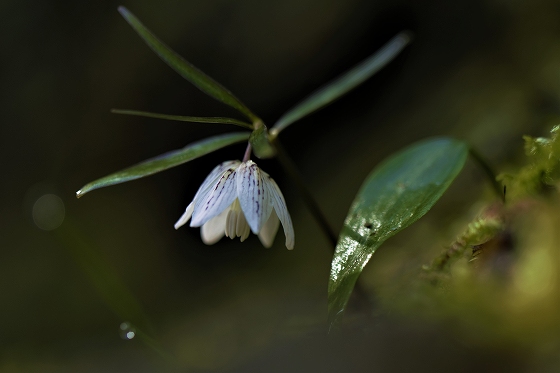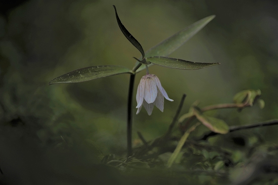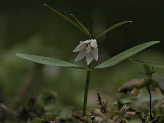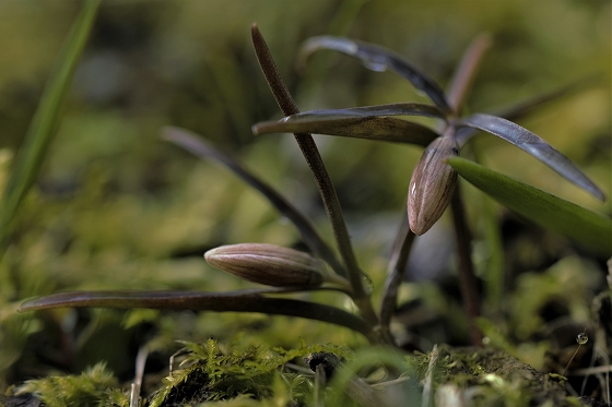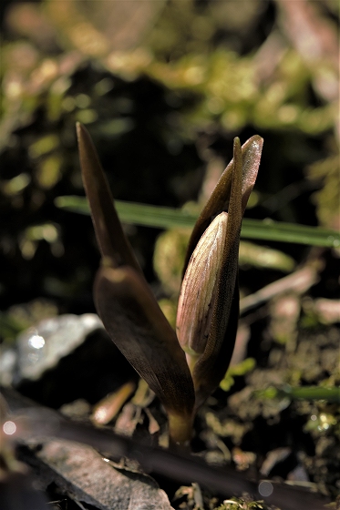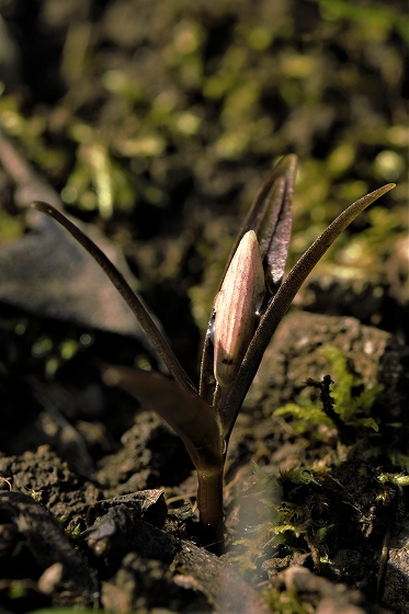 実生から花を咲かすまで5~6年かかります。花をつける株は葉が5枚ついています。上の画像でも5枚の葉っぱが確認できます。花を咲かせた株の右隣の葉っぱも、イズモコバイモの葉っぱですが、この株はまだ花を咲かせるほど成長していないので1枚です。花を咲かせるイズモコバイモはこんな形で地上に現れます。5枚の葉っぱがたたまれた状態です。やがて葉っぱが開いていき、中から蕾が姿を見せます。