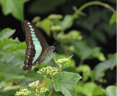 200907/03 アオスジアゲハ 動物 0 アオスジアゲハ(青条揚羽)チョウ目アゲハチョウ科ノブドウらしき花の蜜を吸っていました。めまぐるしく花から花へと飛びまわります。羽のなかの青い条が鮮やかですね。