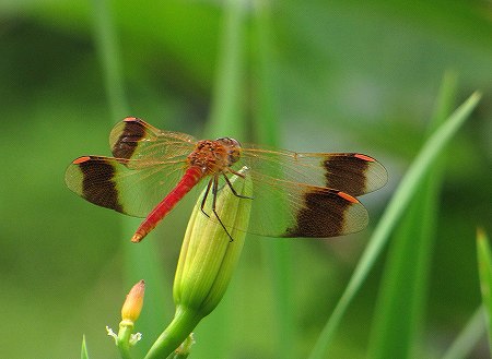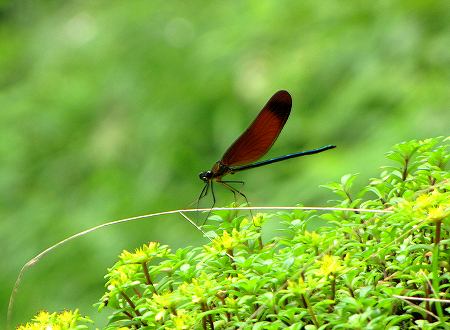 200907/14 龍頭ヶ滝にて 動物 0 大変暑い日々が続く昨今、皆様におかれましてはいかがお過ごしですか?先日、納涼に「龍頭ヶ滝」へ立ち寄りました。その折に見かけたトンボ達の画像です。ミヤマアカネ(深山茜)トンボ目トンボ科「ヤブカンゾウ」の蕾で休息モードの「ミヤマアカネ」さんです。翅の中ほどに帯状に色がつくのはこの方だけなのですぐにそれとわかりますね。ハグロトンボ(羽黒蜻蛉)トンボ目カワトンボ科きれいな体色をしている「ハグロトンボ」さん。ひらひらとびまわって「マルバマンネングサ」の花園で休憩です。《雄滝》