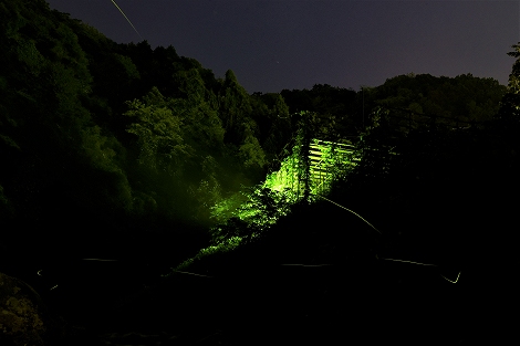 201907/03 無題 未選択 0 7月2日(火)ネット検索して、まだ蛍に逢えそうな場所を探して、美又温泉へ向かった。地元の人に聞くと今年は、蛍の数が少ないのだそうだ。腹ごしらえを済ませ、川岸にカメラを据え、暗くなるのを待つ。あまり気温が高くなく、蒸し暑くないので期待薄だったが、20時を過ぎるころから、徐々に光が増えてきた。画像の中央の施設の照明が少しうるさいのだが、何とか蛍の光跡をとらえることが出来た。地元の方から、「ゲンジボタル」と教えて頂いた。
