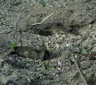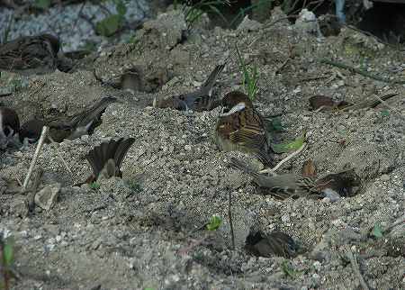 200903/13 砂風呂でも浴びて 動物 0 畑と駐車場の間に、生ゴミや落ち葉を埋めるため地面を掘って埋め戻した箇所がありますが、いつの間にやらスズメさんの公衆浴場になってしまいますた。大盛況です。 (10羽いるのがわかりますか?) PR