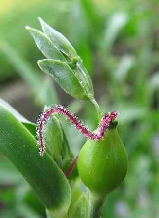 200809/18 数珠玉 植物 0 ジュズダマ(数珠玉)イネ科田んぼの排水路の脇に生えていた「ジュズダマ」さんです。熟した実はお手玉の中身に使われたりしますが、「ハトムギ」さんの原種だそうで薬用にもなります。雌花です。