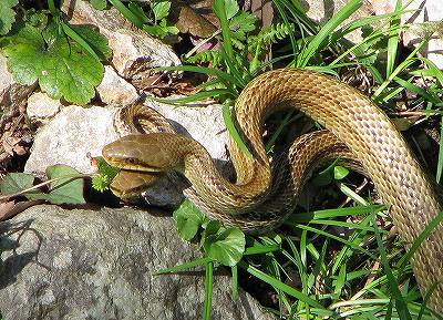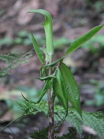 高の峯山からおりて、昼飯たばこをして「清久山」に向かふ。以前、知人から眺望の良い山と聞いた事があり、いつか登ろうと思っていた。登山口の大きな案内板の手前に駐車し、歩き出す。山手の民家の土蔵裏から薄暗い竹林の中へ、そこでマムシグサがお出迎え。マムシグサ(蝮草)