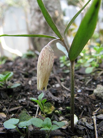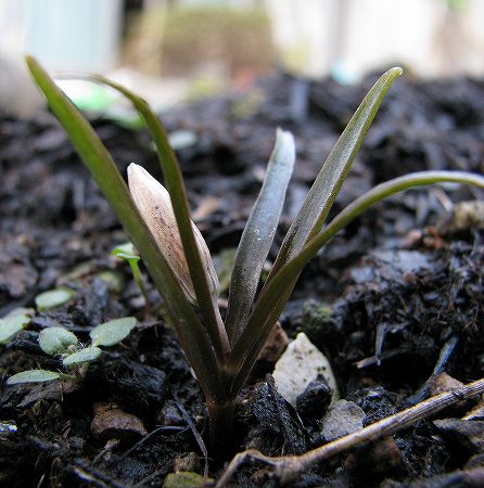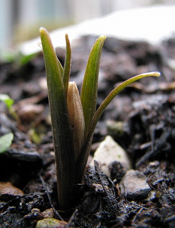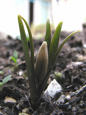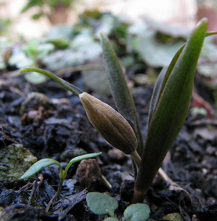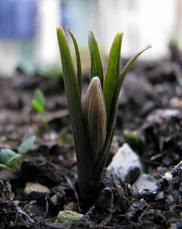 200802/25 庭の住人15 植物 0 2月25日(月)荒天と積雪のため、2日間妖精を観ずにいた。雪が解けたので観にいくと変化があった。春の妖精 高さ:25mm蕾が、葉の包囲網から飛び出すような格好になった。
