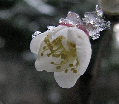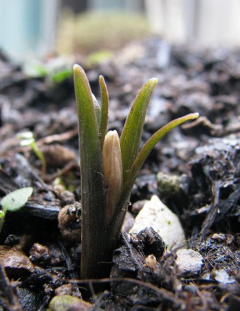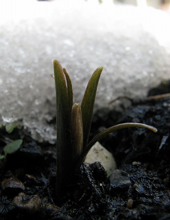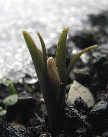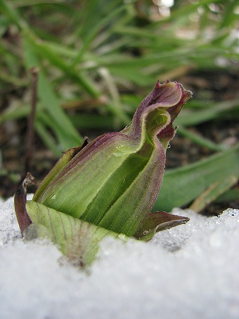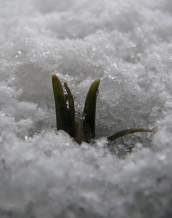 200802/14 庭の住人8 未選択 0 2月14日(木)庭には2羽鶏・・・、庭には昨日の雪がところどころ残っていますが、例の植物の箇所は解けていました。雪の中でも蕾は耐えて少し大きくなったようです。芽出しに気づいて10日目