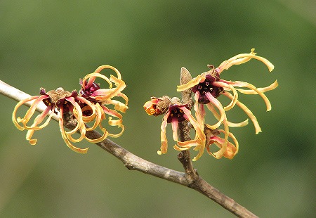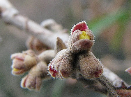 200802/16 春の兆し 植物 0 2月16日(土)皆さんは、簸川郡斐川町出西(しゅっさい)にある「三本松自然公園」をご存知でしょうか。ちょうど「出西窯」の南の山にあります。そこに早春に花を咲かせる植物があることを、思い出していってきました。その植物はこんな樹皮をしています。こんな冬芽です。上の画像が葉芽です。下のが花芽というか、もう蕾ですね。開きかけています。もうお解かりでしょう。「マンサク」です。ただ、此処のマンサクは植栽ですので「シナマンサク」かもしれません。いずれにせよ、早春の花に出逢えて嬉しかったです。